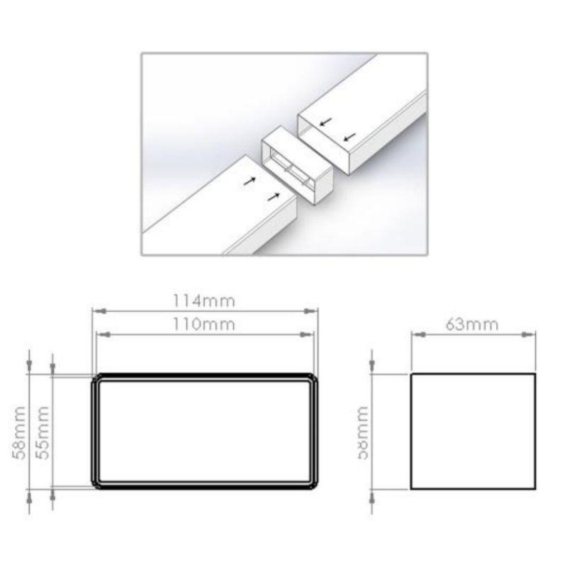 This is our 110x54mm flat channel connector that joins two legnths of duct. The system 100 rectangular 110x54mm ducting range offers the ideal ventilation solution for traditional fan installations into extensions and refurbishment properties.