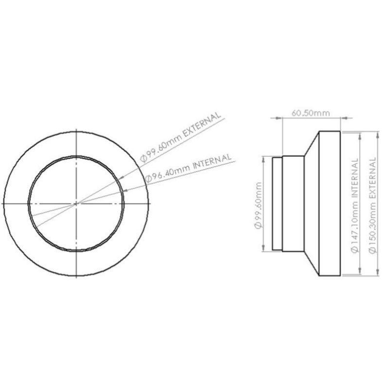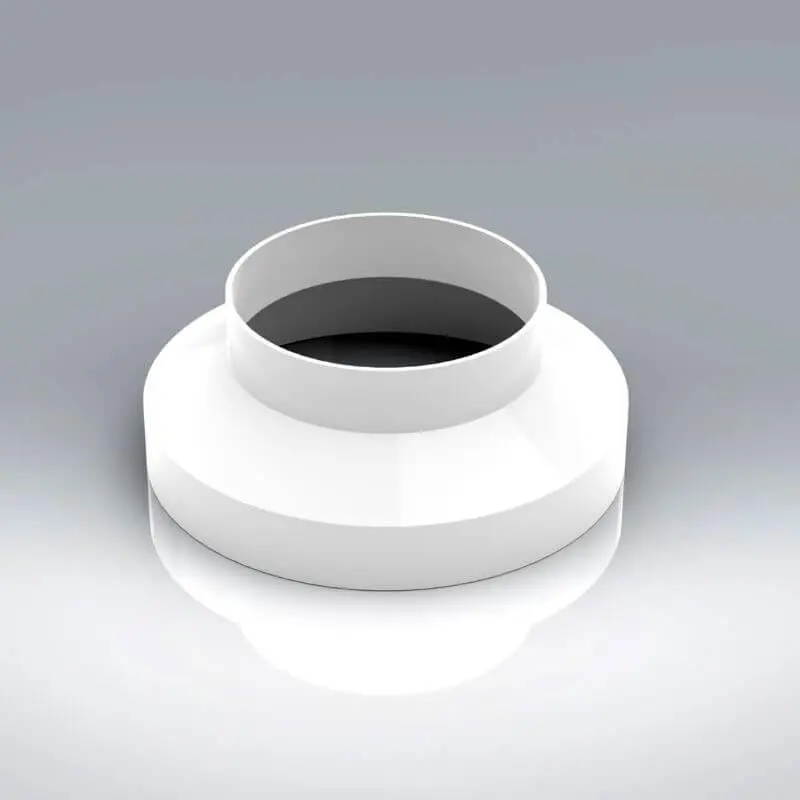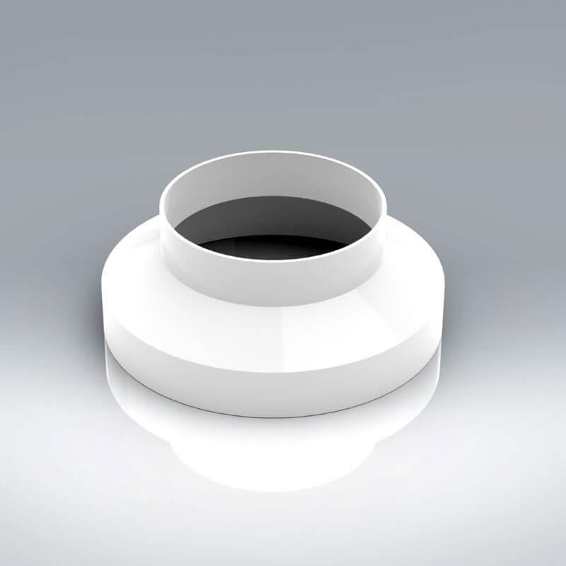 The VKC437 150mm – 100mm diameter Reducer is manufactured from (white) High Impact Polystyrene, which has a minimum free area of 16,994mm² on the 150mm diameter side reducing to a free area of 7,298mm² on the 100m side. The 150mm side fits over the System 150 fittings and the 100mm side has a male spigot for connection inside of the System100 duct.