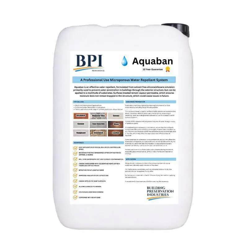 Aquaban is an effective water repellent, formulated from solvent free silicone/siloxane emulsion primarily used to prevent water penetration in buildings through the exterior structure, but can be applied to a multitude of substrates. Surfaces treated remain vapour permeable, which ensures moisture does not remain trapped in the structure, which could cause issues in future.