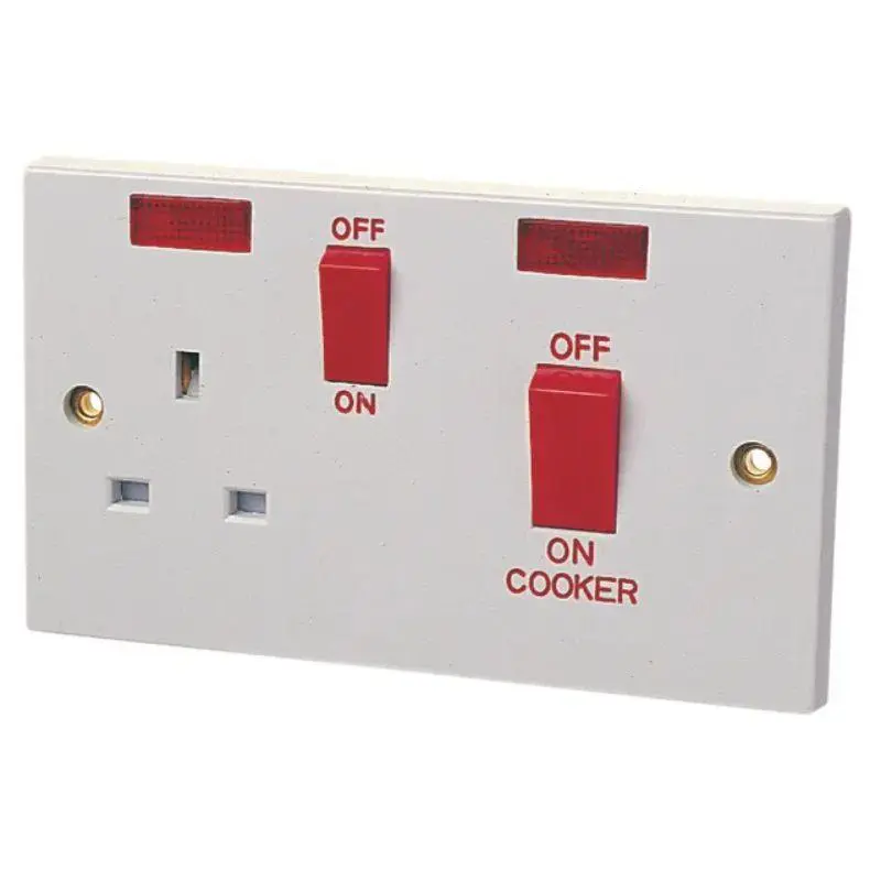 Dencon White Moulded Plastic 45A Double Pole Cooker Switch with 13A Switched Socket.