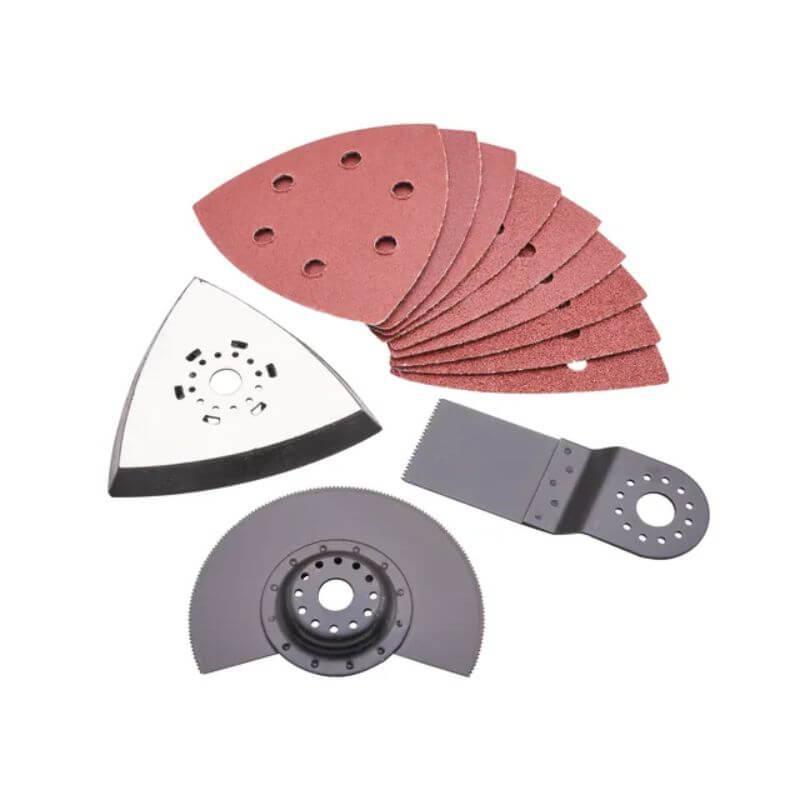 Includes several accessories including sandpaper x 9 for wood & metal (3 x each P60, P80, P120), scraper, plunge-cut saw blade for wood and plastic, segment saw blade for wood, plastic and soft metal (HSS).
