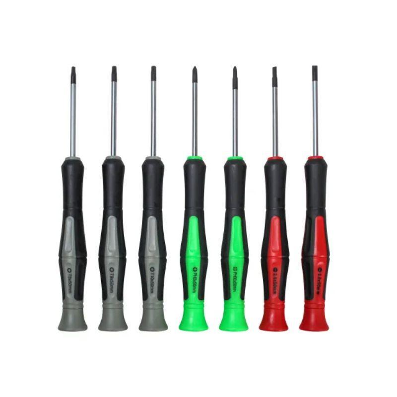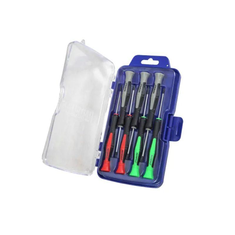 The mini set consists of seven precision soft-grip screwdrivers designed for use on small screws. Each screwdriver features a chrome vanadium steel blade with a black tip.