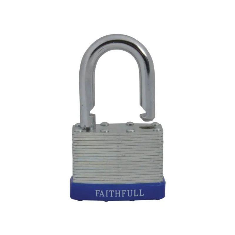 The Faithfull Laminated padlocks are manufactured using individually galvanised plates with a case hardened steel shackle. They are designed for use where a higher level of security is required. Each lock features a high strength, brass cylinder mechanism that is accurately machined, durable and rust resistant and has a stainless steel shackle spring.