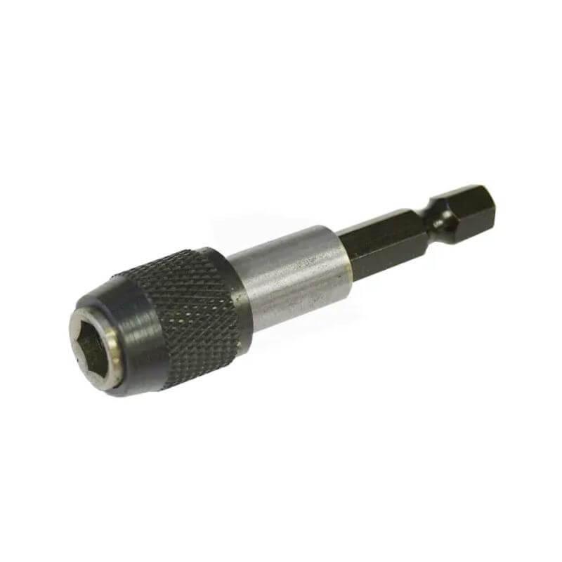 For use in handheld drivers or power drills, this 1/4in female by 1/4in male magnetic bit holder has a hardened and tempered steel shaft with a quick-release chuck.
