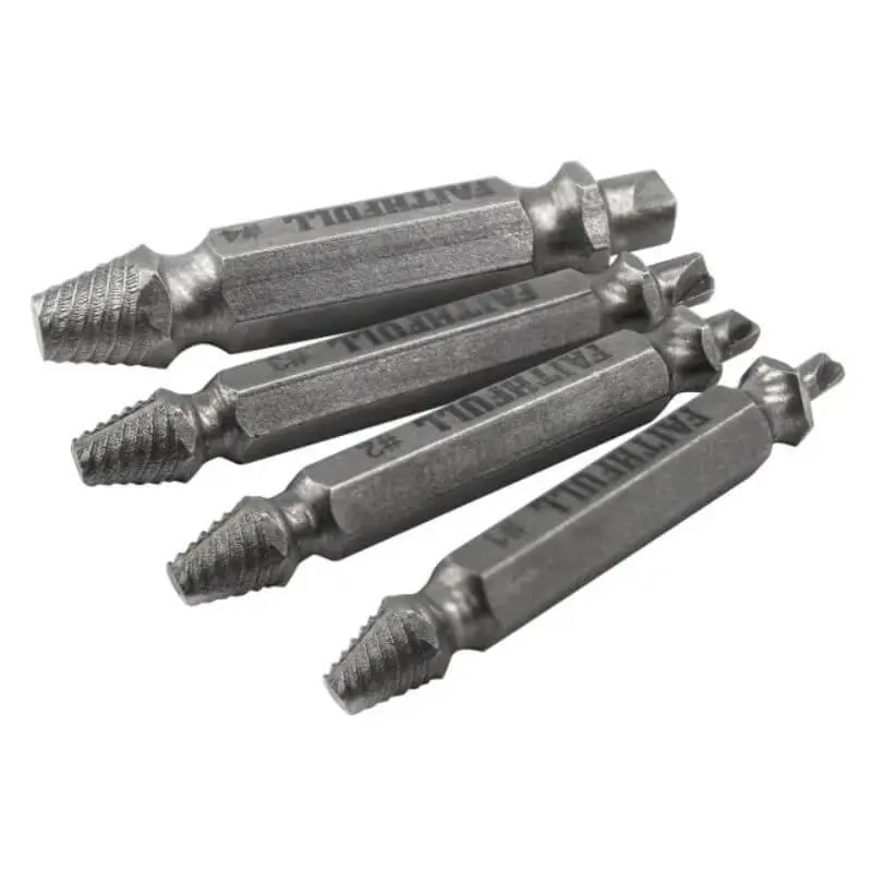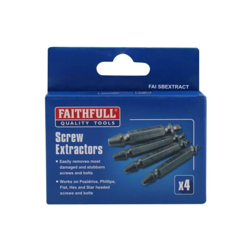 The Faithfull 4 Piece Screw Extractor Kit easily removes even the most damaged and hard to remove screws and bolts. The bits have a self-centring tip and are manufactured from hardened tool steel and double tempered for extra hardness. They will remove screws from wood, metal or plastic, or screws manufactured from any alloy including soft brass and free-spinning screws. Works on the following types of screw and bolts: Pozidrive, Phillips, Flat, Hex and Star Headed, even jagged and uneven breaks. They can be used with most power drills.