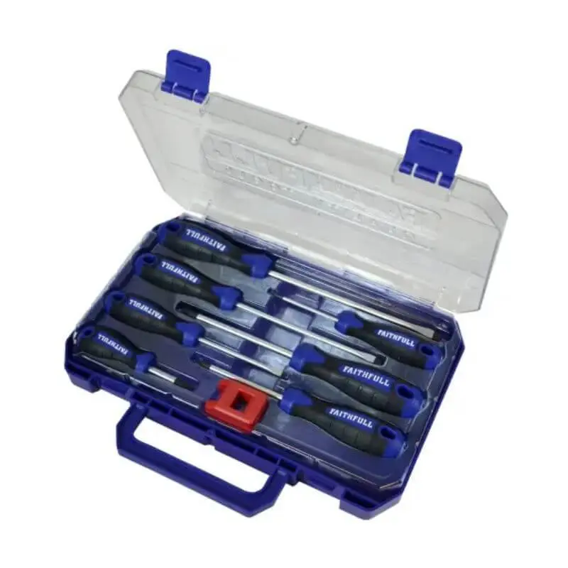 The Faithfull 8 Piece Screwdriver Set is a versatile set featuring the seven most popular Slotted, Phillips and Pozidriv screwdrivers, with correctly hardened and tempered Chrome Vanadium steel blades and full size bi-material soft-grip handles for maximum user comfort and firm non-slip grip.