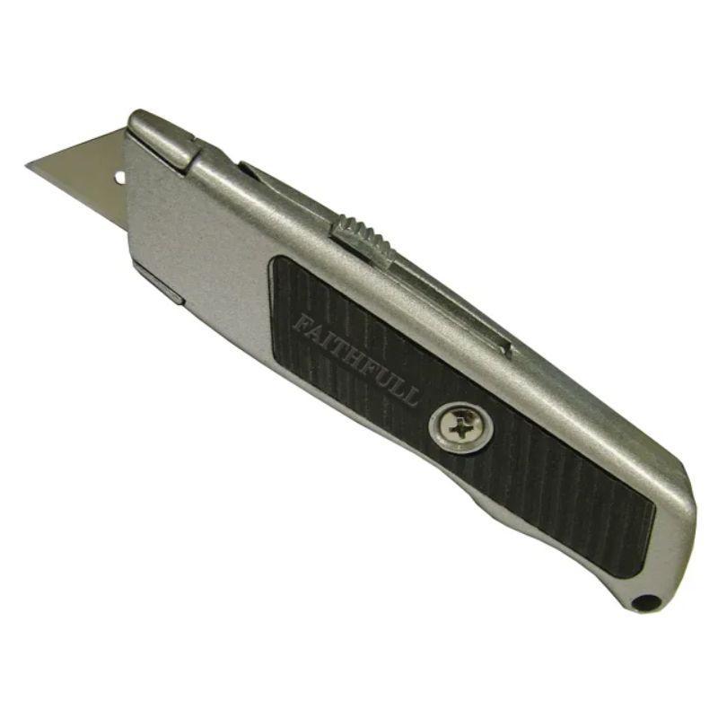 The Faithfull all-purpose Trimming Knife comes with a strong die cast metal body fitted with an anti-slip grip and a thumb operated slide with three pre-set blade depths, fully retractable blade for safe storage and internal storage for replacement blades.