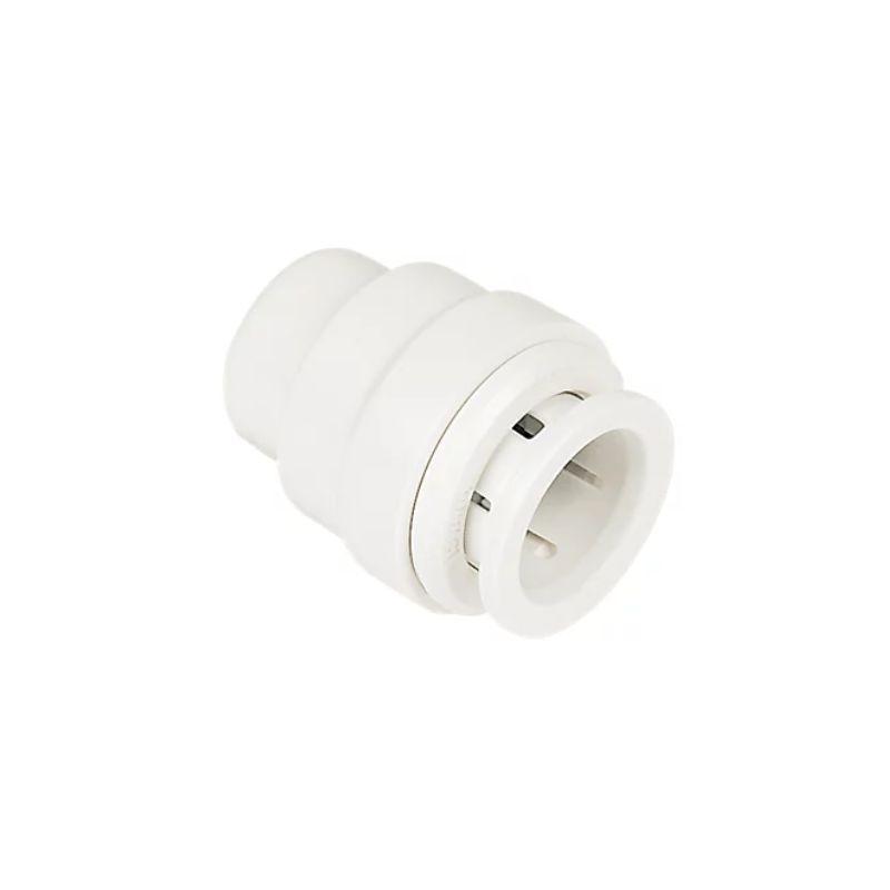 The John Guest Speedfit PSE4615W is a 15mm push-fit plastic stop end cap used to seal off copper or plastic pipes in domestic hot/cold water and central heating systems, offering a quick, tool-free, flame-free installation and demounting for temporary or permanent use. It features a secure grip and seal collet, resists corrosion, and is BSI & WRAS approved for safe use in various plumbing scenarios.